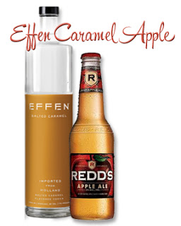 Effen caramel vodka and an Angry Orchard Hard Cider mixed together, with a slice apple wedge garnish. |